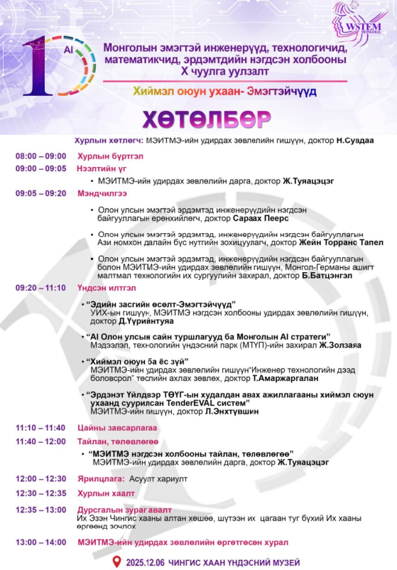 Монголын Эмэгтэй Инженерүүд, Технологичид, Математикчид, Эрдэмтэд (МЭИТМЭ)-ийн нэгдсэн холбооны бүх гишүүдийн 10-р чуулга уулзалт нь Чингис хаан үндэсний музейд 2025 оны 12-р сарын 6-ны 8:30-14:00 хооронд Хиймэл оюун ухаан- Эмэгтэйчүүд" сэдвийн дор танхим болон цахим хосолсон хэлбэрээр зохион байгуулагдах тул гишүүд та бүхнийг хүрэлцэн ирэхийг уръя.